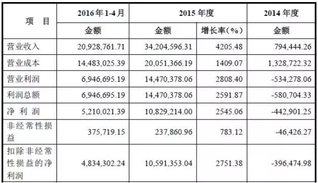 恒荣汇彬2015年度与2014年度相比,营业收入增长4205.48%,净利润增长2545.06%;而2016年1-4月净利润已达521万,占2015年度全年净利润的48.1%,可以说这是一份靓丽的报表。