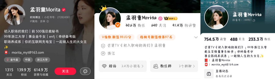 图:孟羽童小红书、微博、抖音粉丝量截图