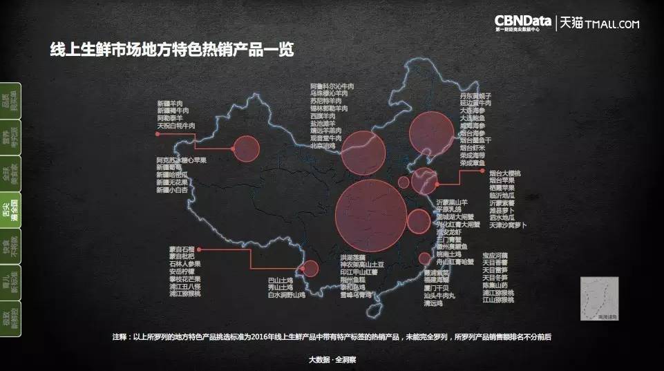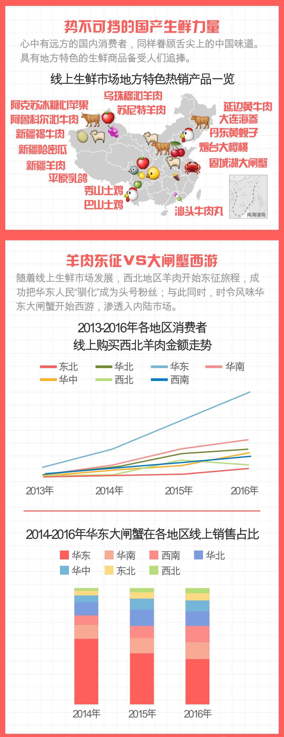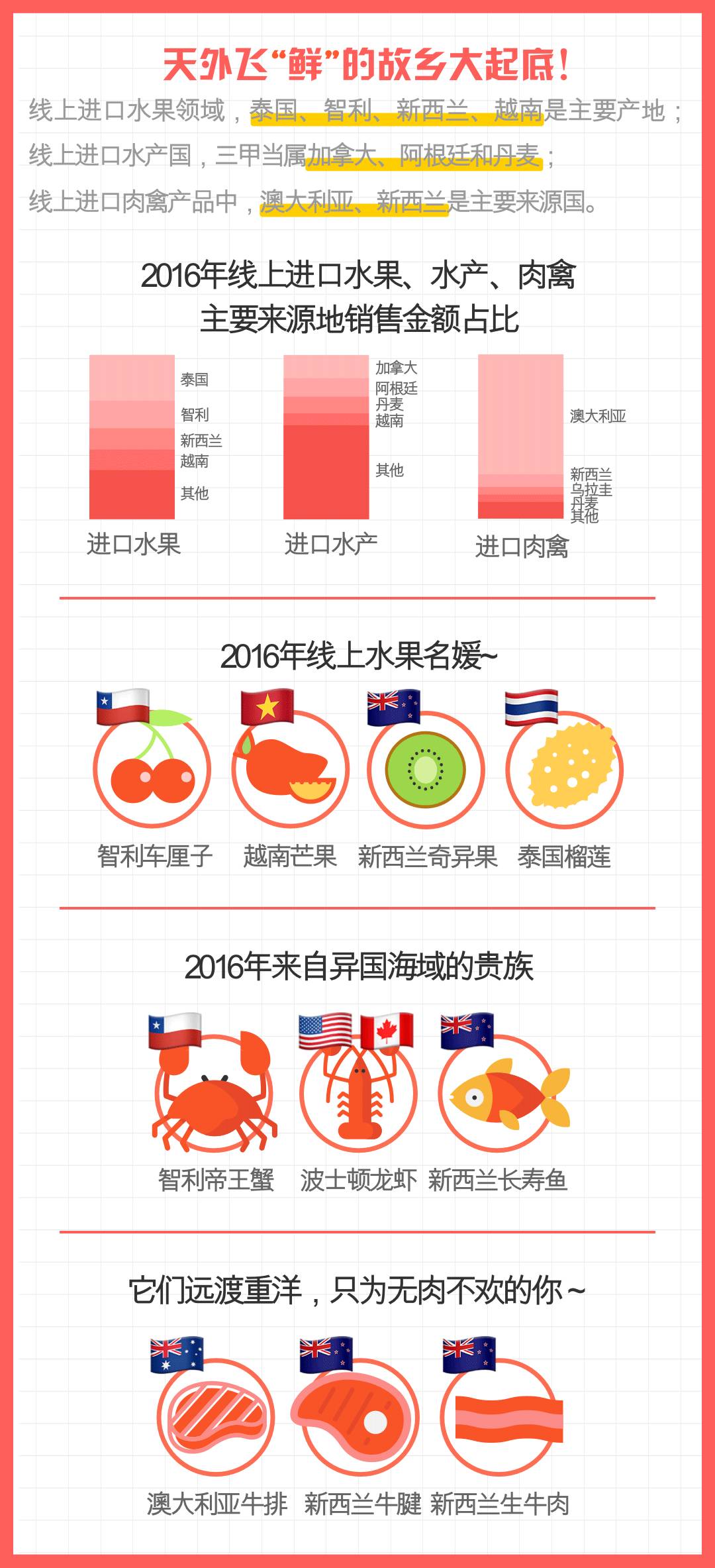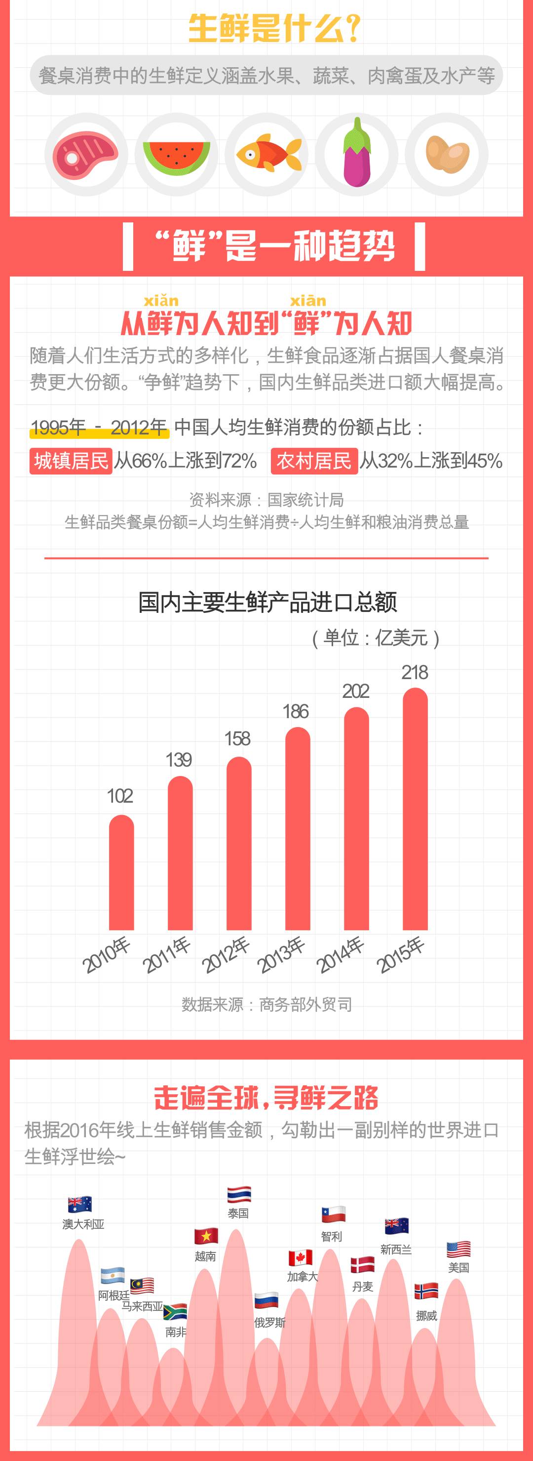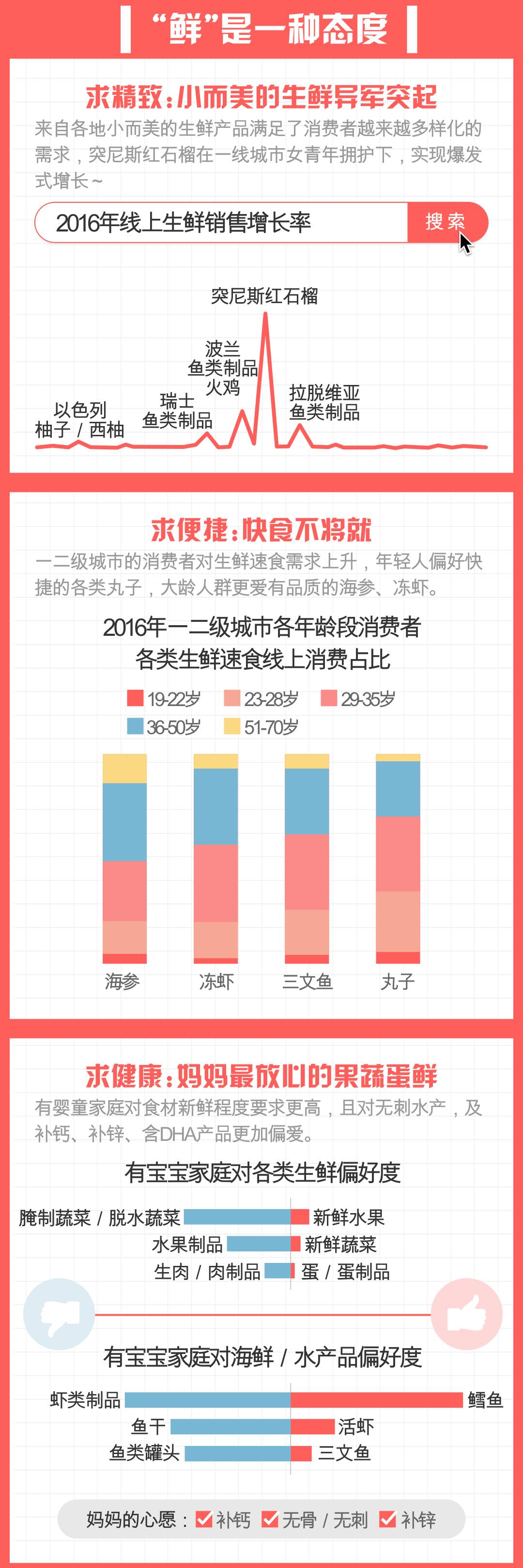 1月5日,第一财经商业数据中心(CBNData)联合天猫发布《2017中国家庭餐桌消费潮流报告》(以下简称为《报告》),详解国民的最新餐桌消费趋势。《报告》基于阿里巴巴大数据,显示中国消费者越来越愿意为质量可控、营养均衡、丰富多样和加工便捷的食材买单,“鲜”成为餐桌消费升级的核心主题。作为最懂吃的一群人,中国消费者对进口生鲜产品的需求日益增加,其中,水产品、水果和肉禽产品是最主流的进口品类,增长明显。