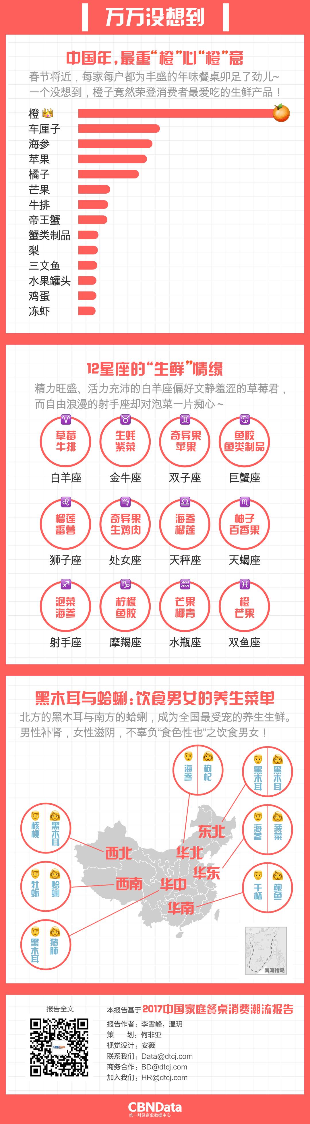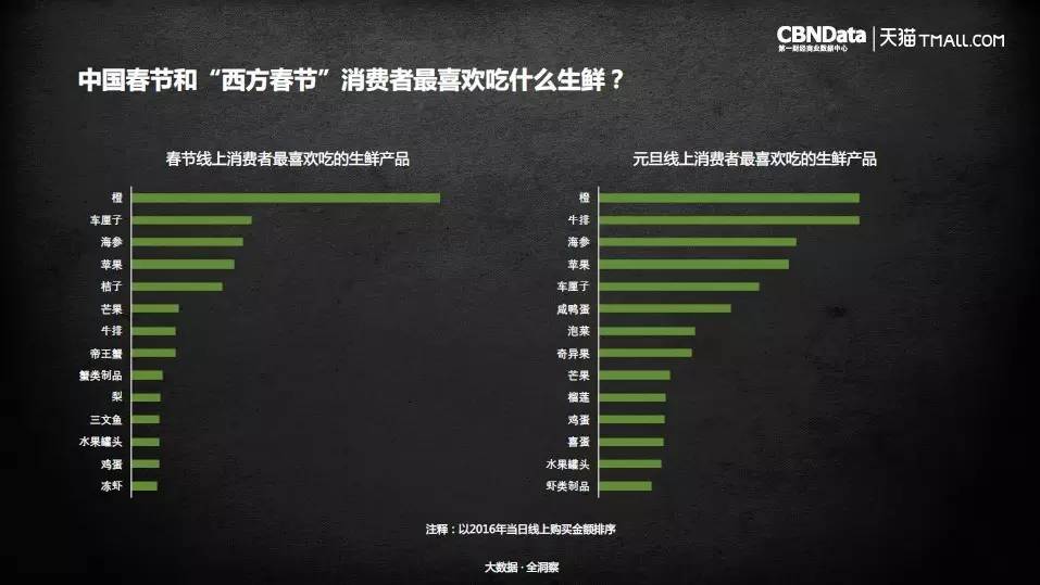 那春节该吃点啥?大数据告诉你,水果、海鲜少不了。CBNData《报告》显示,在春节期间,消费者最喜欢购买的是生鲜产品分别是橙子、车厘子、海参、苹果、桔子、芒果、牛排、帝王蟹、梨和三文鱼。不过,基于2015年到2016年不同年龄层喜好度提升最快的生鲜产品数据,如果家里年轻人比较多的话,今年不妨多准备一些冷冻章鱼、虾仁和各种丸子;如果为中年人准备,可别忘了备着青口贝、冻虾、扇贝柱;若孝敬老人的话,各种新鲜蔬菜、海带、冻虾可别忘了多买点。