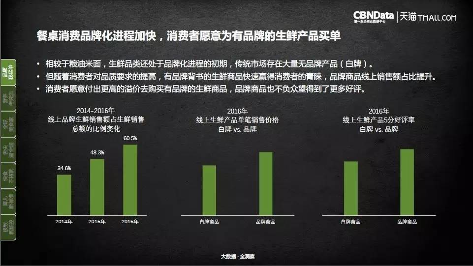 CBNData《报告》显示,随着消费者对品质要求的提高,有品牌背书的生鲜商品快速赢得消费者的青睐,品牌商品线上销售额占比提升,2014-2016年,线上品牌生鲜销售额占生鲜销售总额比例从34.6%上升到60.5%。究其原因,消费者越来越看重的是品牌所保障的生鲜品质,产地环境、生产生长采摘周期、饲料/肥料状况、生产加工技术、分拣质控标准、运输时效、卖家对生产源头的控制能力都是消费者所关注的新品质维度。