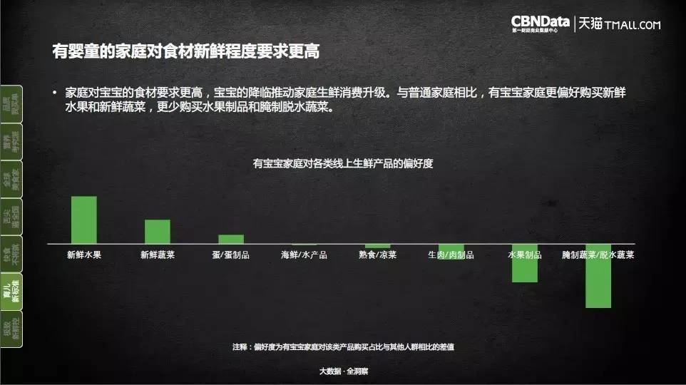 但对于有婴童的家庭而言,对生鲜的要求更高,宝宝的降临推动家庭生鲜消费升级。与普通家庭相比,有宝宝家庭更偏好购买新鲜水果和新鲜蔬菜,更少购买水果制品和腌制脱水蔬菜。CBNData《报告》显示,有宝宝家庭对鳕鱼、虾、三文鱼等少刺海鲜产品偏好度更高;在营养成份方面,有宝宝家庭对补钙、补锌、含DHA产品更加偏爱。