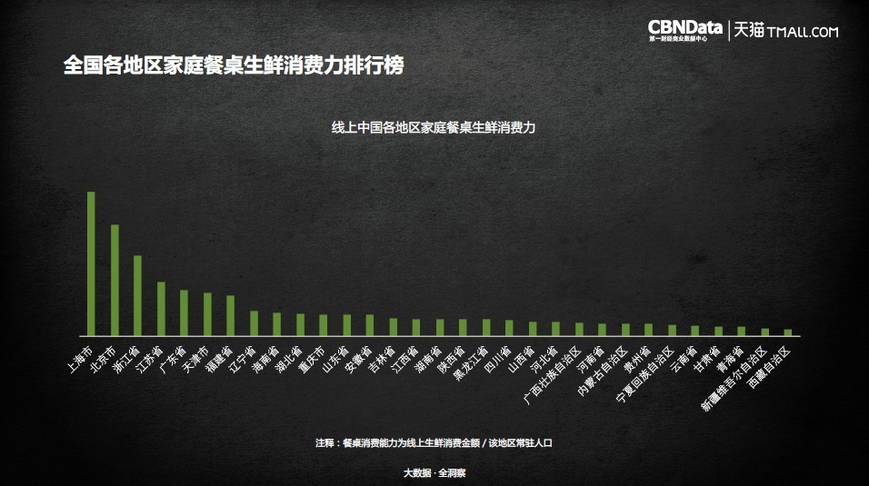 哪里的人吃得最“鲜”?CBNData《报告》显示,一线城市在生鲜消费上表现出了强势的消费力,上海、北京分列全国各地区家庭餐桌生鲜消费力排行榜的前两位,浙江、江苏、广东三省紧追其后。而西部内陆省份居民的生鲜消费习惯有待养成,青海、新疆、西藏三省位列生鲜消费排行榜后三位,西藏排名最后。