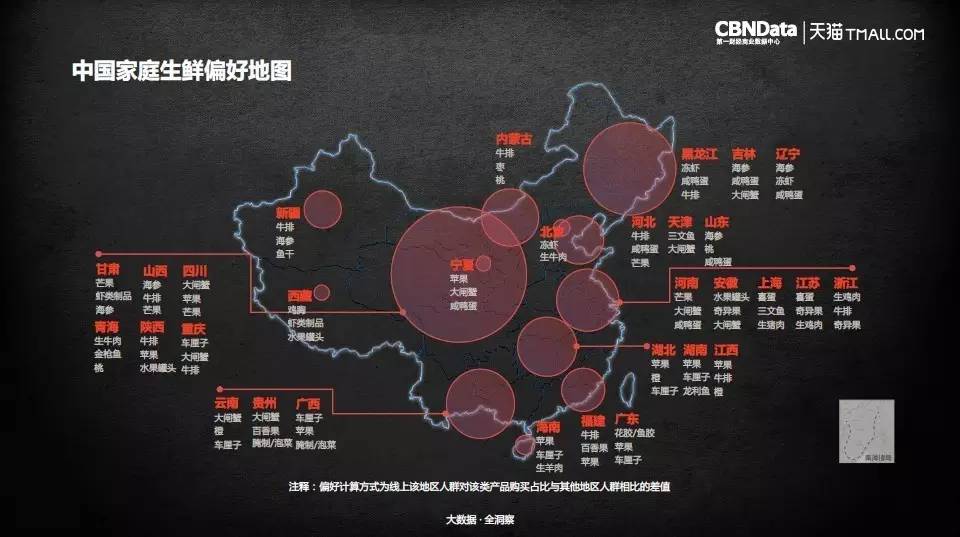 虽然都爱吃生鲜,但各个地区消费者偏好的生鲜品类不尽相同。CBNData《报告》显示,北京人民热爱冻虾、生牛肉和海鲜鱼类,上海人对三文鱼的爱名不虚传,排在其生鲜购买清单前三位的品类是喜蛋、三文鱼和生猪肉。吃功深厚的广东人则对鱼胶、苹果、车厘子爱不释口,另外,腌制泡菜也是他们的爱。