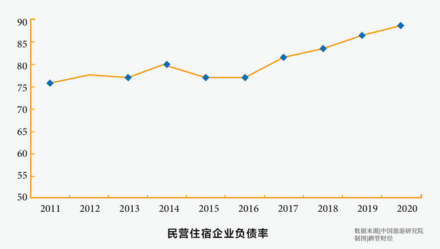 中国旅游研究院产业研究所所长杨宏浩,在今年初撰写的《中国酒店集团资本化道路与未来方向》文章中援引数据显示,2011年,民营住宿企业负债为75.46%,此后逐步上行,2017年突破80%,2019年达到86.78%,2020年因疫情原因又提升到88.48%,债务负担持续膨胀。