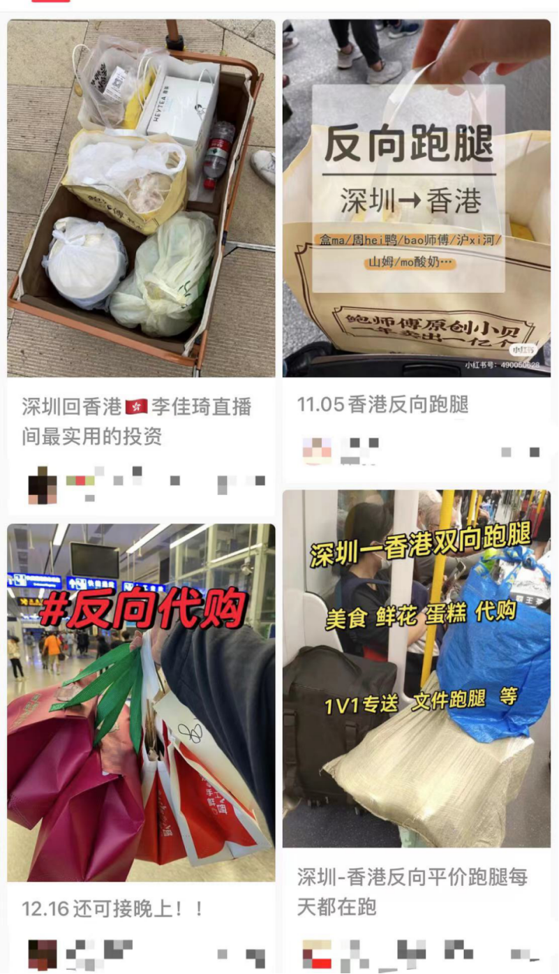 很难追溯这股“反向消费”的潮流是怎么兴起的。从暑期开始,社交平台上就出现了大量“北上深圳攻略”,也有不少人做起了代购跑腿的生意,他们每天发帖接单,从鲍师傅、奶茶到常用药品,甚至“火锅跑腿能端着锅过海关”。一般代购们在深圳买好东西会沿着香港地铁线送到各个站点,有一次林丽恒也找了个代购跑腿,送到自家楼下的地铁站才收费60元,“算下来也比自己过去划算”。