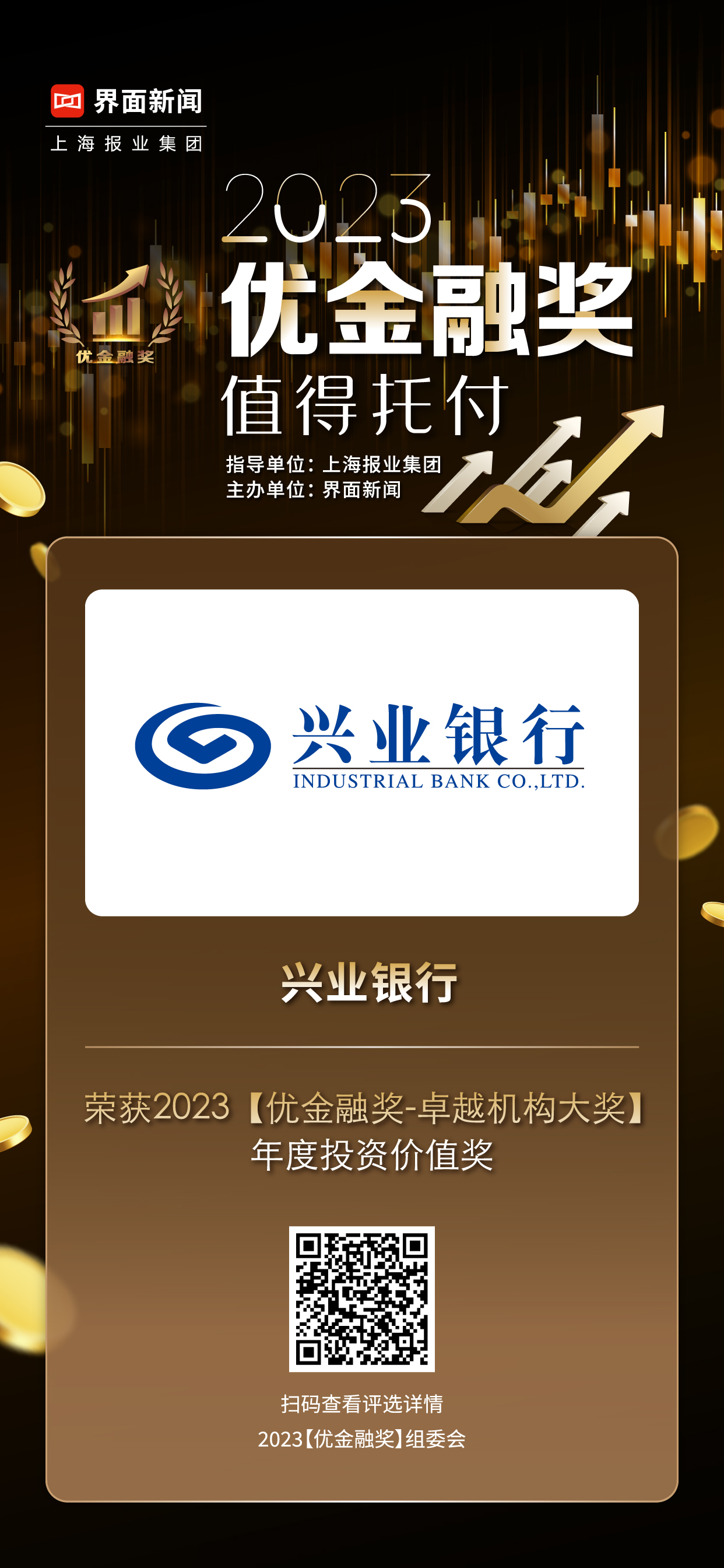 12月20日,上海报业集团|界面新闻在上海前滩香格里拉酒店举办了2023【优金融奖】颁奖典礼,并正式公布了本年度获奖名单。在这项万众期待的金融业年度评选中,来自银行、保险、证券基金、信托、资管、金融科技、财富管理、移动支付、融资担保等领域的金融机构与企业,凭借年度市场表现与行业影响力,获得年度大奖。其中,兴业银行凭借其在行业内的优异表现,荣膺卓越机构大奖——年度投资价值奖。