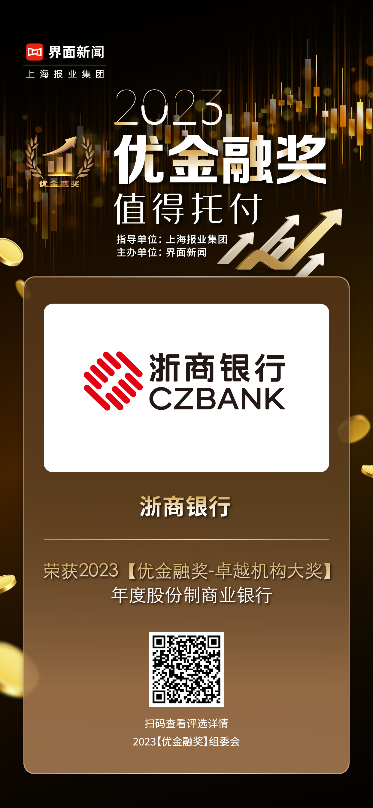 12月20日,上海报业集团|界面新闻在上海前滩香格里拉酒店举办了2023【优金融奖】颁奖典礼,并正式公布了本年度获奖名单。在这项万众期待的金融业年度评选中,来自银行、保险、证券基金、信托、资管、金融科技、财富管理、移动支付、融资担保等领域的金融机构与企业,凭借年度市场表现与行业影响力,获得年度大奖。其中,浙商银行凭借其在行业内的优异表现,荣膺卓越机构大奖——年度股份制商业银行。