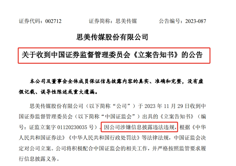 根据11月30日公告,思美传媒因涉嫌信息披露违法违规,于11月29日收到证监会下发的立案告知书。
