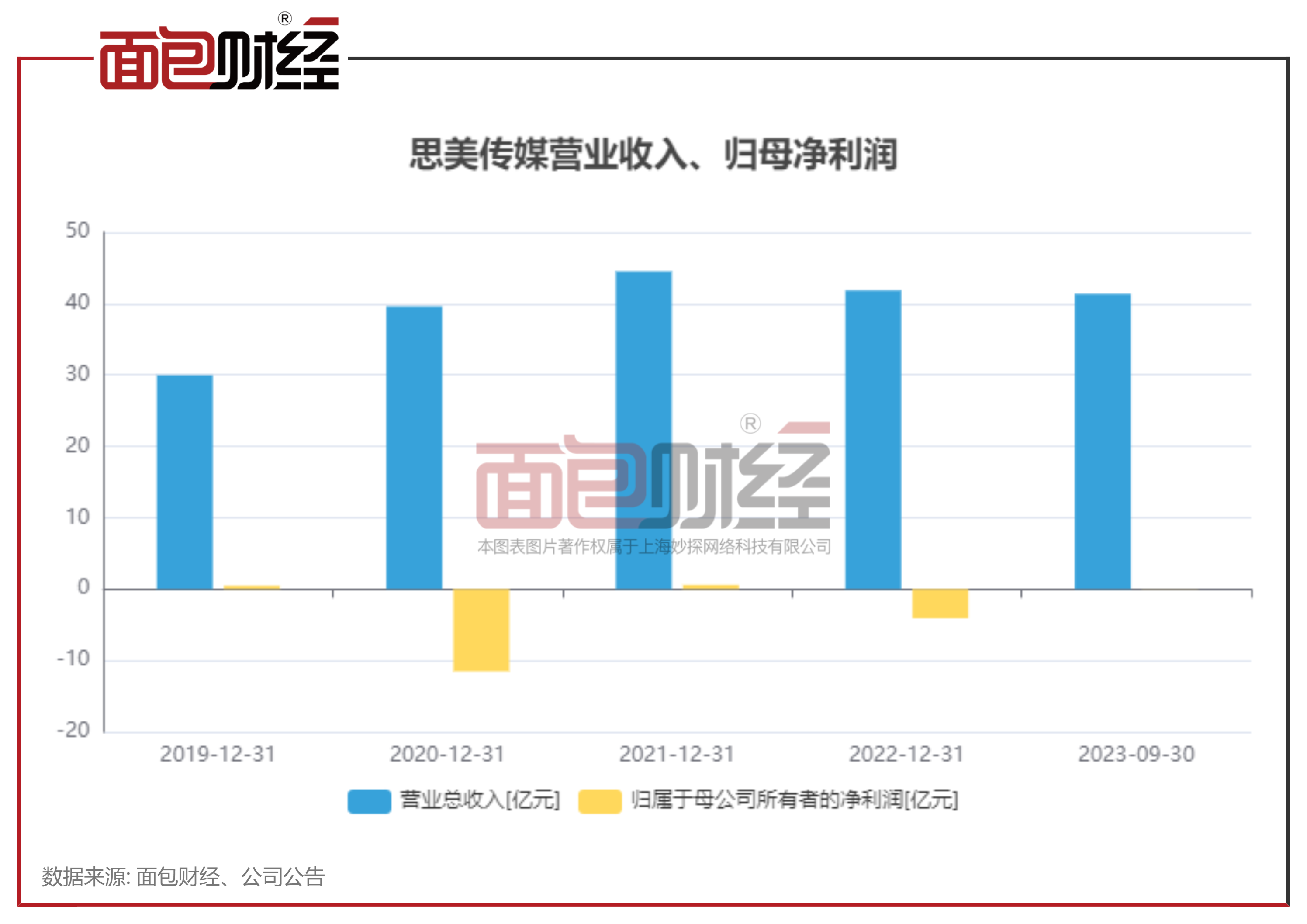 2023年前三季度,思美传媒实现营收41.38亿元,同比上涨33.74%;归母净利润-428.76万元,同比下降178.13%;扣非后归母净利润为-936.24万元。