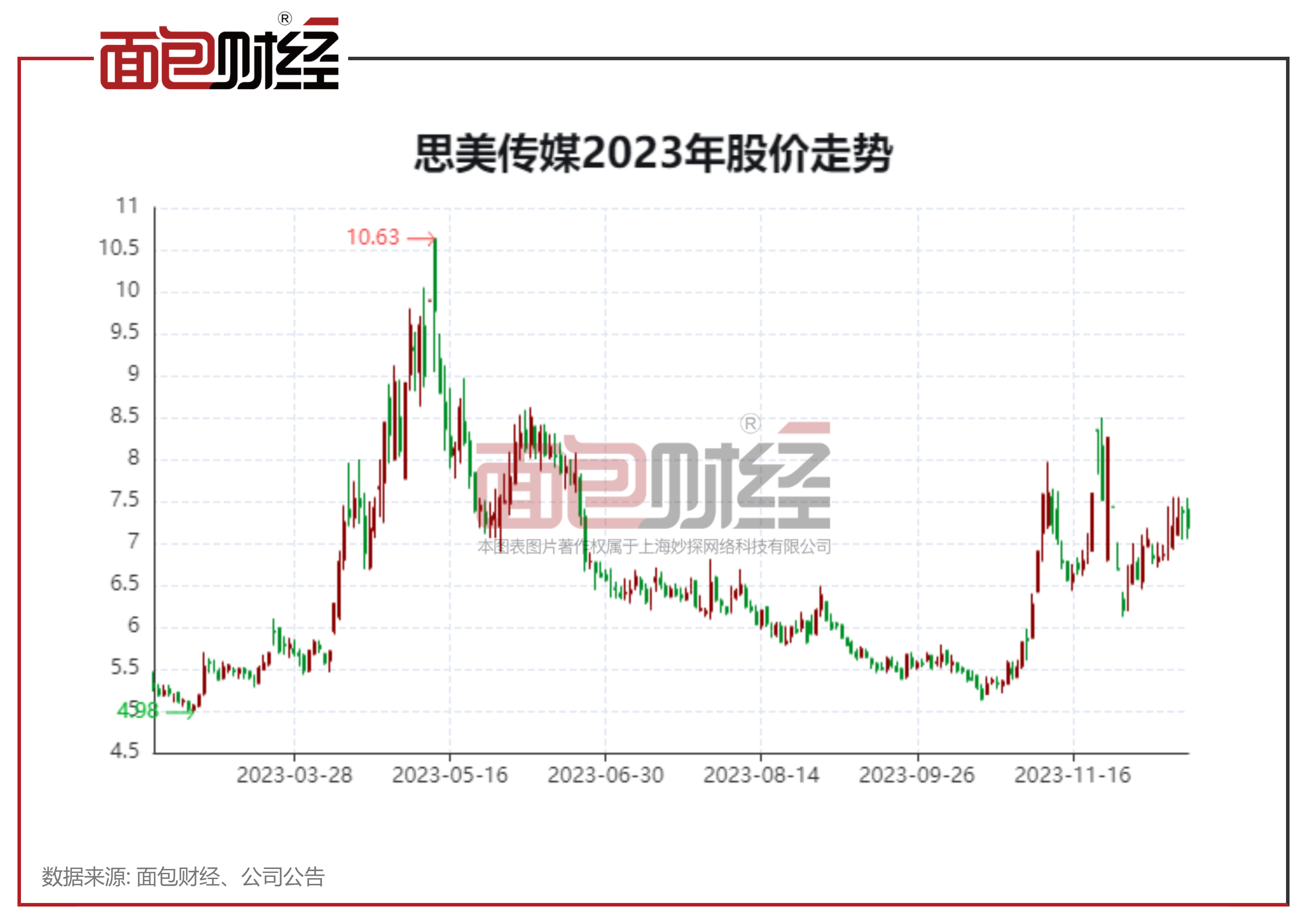 业绩走弱,思美传媒的股价表现则出现较大反差。2023年4月,思美传媒股价快速攀升,2023年5月最高达到10.63元/股(前复权,下同),年初以来涨幅超过九成,总市值超过50亿元。此后,公司股价加速下滑,最低记录5.12元/股。