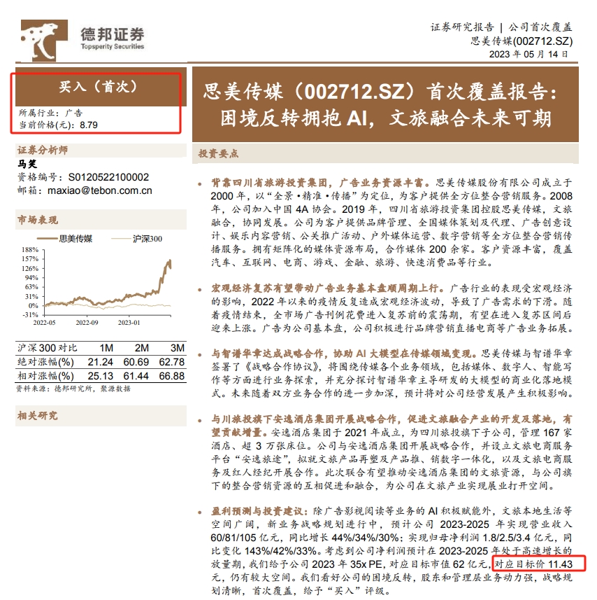 面包财经梳理公开资料发现,德邦证券在思美传媒股价相对高点曾给予“买入”评级,给出目标价11.43元。与公司实际股价表现对比,德邦证券的目标价偏离较大。