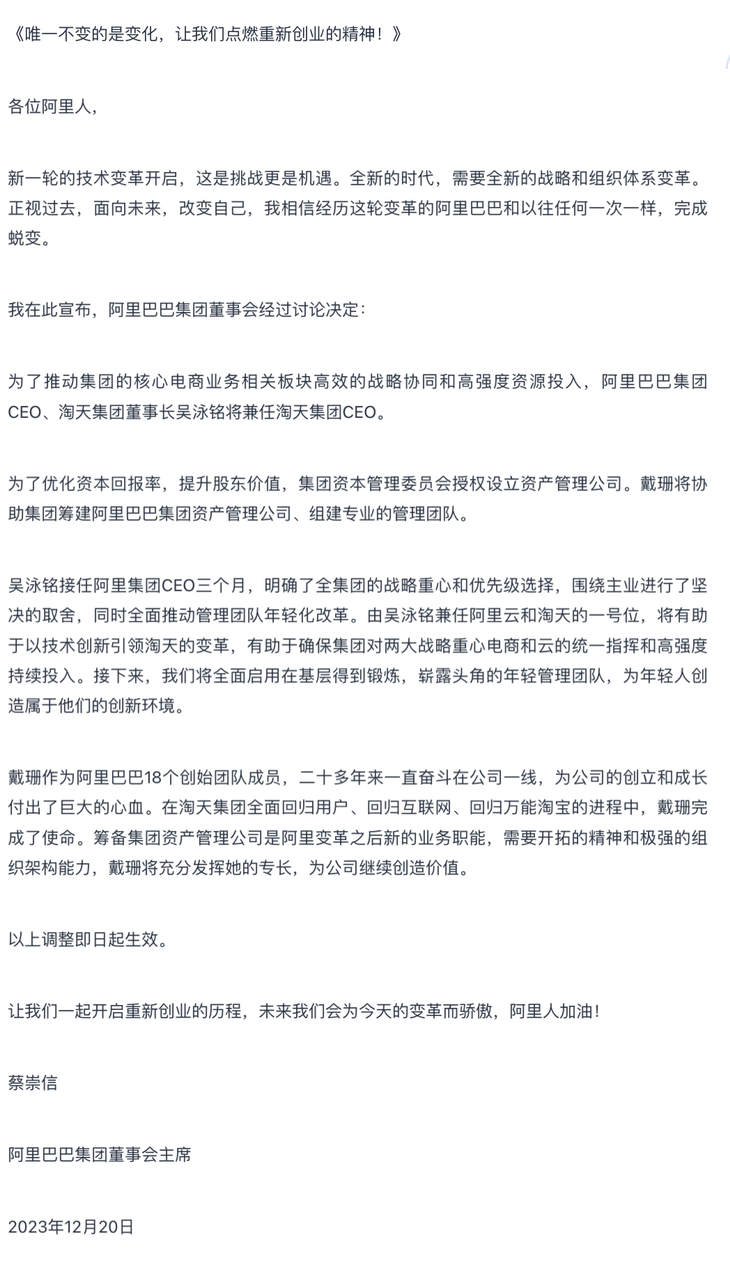 阿里巴巴集团董事会主席蔡崇信更是通过全员信宣布了这项任命,并表示,“全新的时代,需要全新的战略和组织体系变革。正视过去,面向未来,改变自己,相信经历这轮变革的阿里巴巴将完成蜕变。”