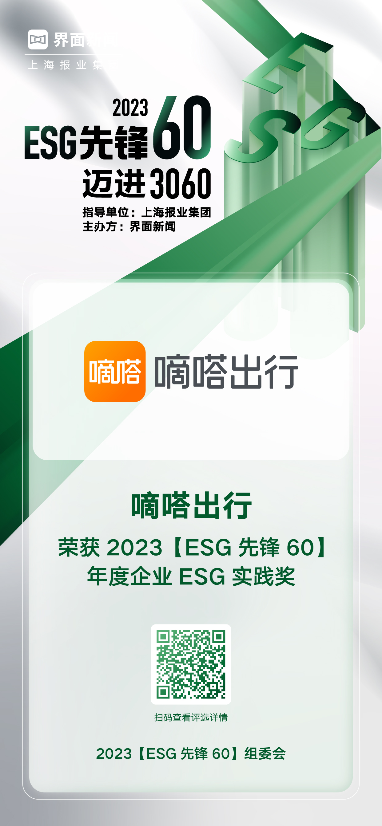 12月20日,上海报业集团|界面新闻在上海前滩香格里拉酒店举办了2023【ESG先锋60】颁奖典礼,并正式公布了本年度获奖名单。在这项万众期待的关于ESG议题的年度评选中,来自各行各业的绿色先锋企业与先锋探索人物,凭借年度市场表现与行业影响力,获得年度大奖。其中,嘀嗒出行凭借其在行业内的优异表现,荣膺年度企业ESG实践奖。