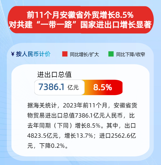 不久前,合肥海关公布了安徽省货物贸易进出口情况:2023年前11个月,安徽省货物贸易进出口总值7386.1亿元人民币,比去年同期增长8.5%。值得关注的是,在全国外贸进出口总值同比基本持平的情况下,安徽省进出口、出口分别较全国高出8.5%、13.4%,实现了一定幅度增长。