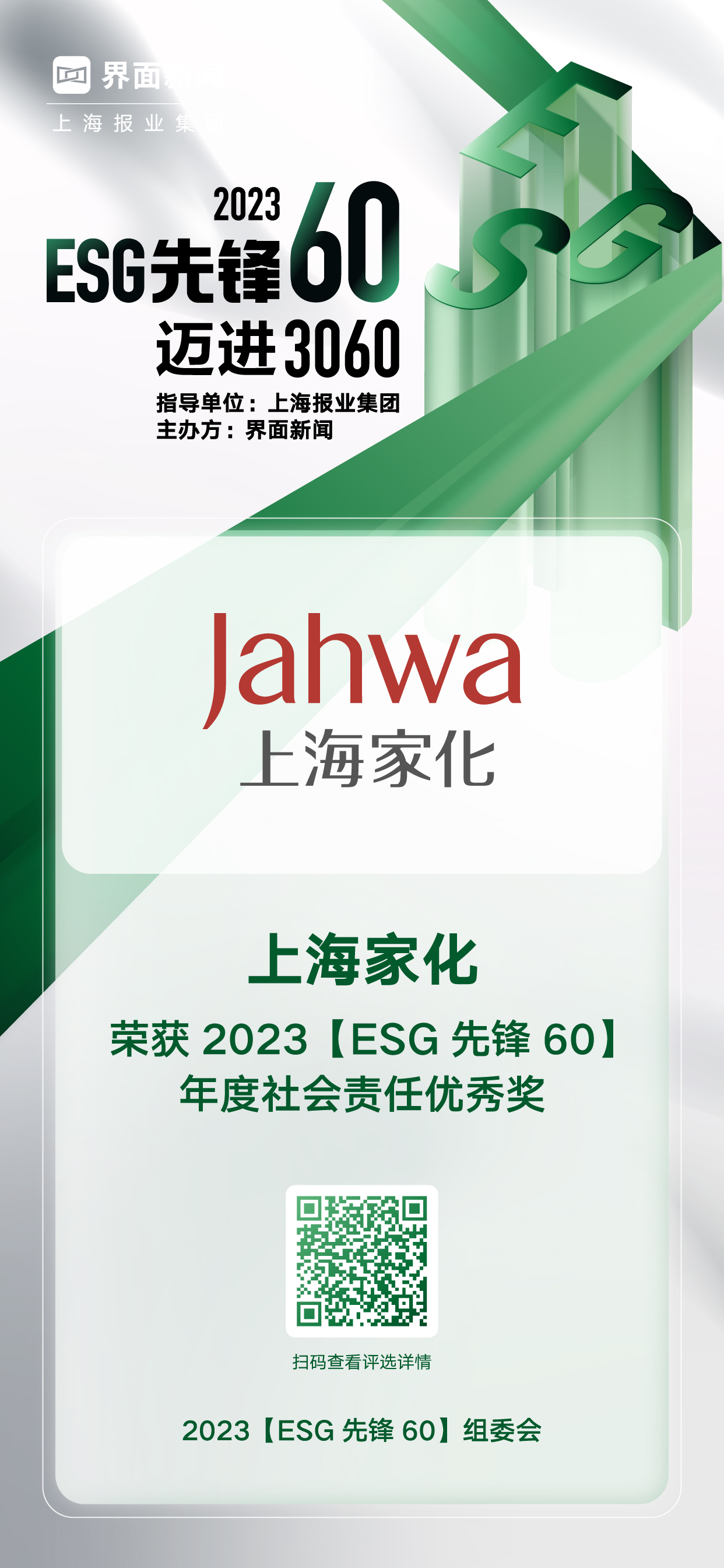 12月20日,上海报业集团|界面新闻在上海前滩香格里拉酒店举办了2023【ESG先锋60】颁奖典礼,并正式公布了本年度获奖名单。在这项万众期待的关于ESG议题的年度评选中,来自各行各业的绿色先锋企业与先锋探索人物,凭借年度市场表现与行业影响力,获得年度大奖。其中,上海家化凭借其在行业内的优异表现,荣膺年度社会责任优秀奖。