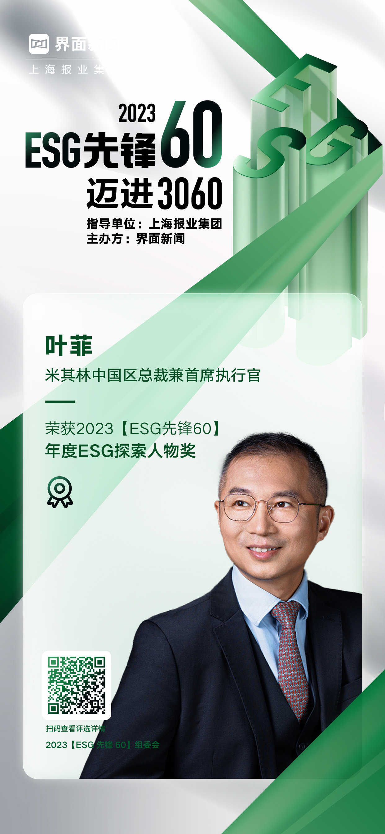 12月20日,上海报业集团|界面新闻在上海前滩香格里拉酒店举办了2023【ESG先锋60】颁奖典礼,并正式公布了本年度获奖名单。在这项万众期待的关于ESG议题的年度评选中,来自各行各业的绿色先锋企业与先锋探索人物,凭借年度市场表现与行业影响力,获得年度大奖。其中,米其林中国区总裁兼首席执行官叶菲凭借其在行业内的优异表现,荣膺年度ESG探索人物奖。