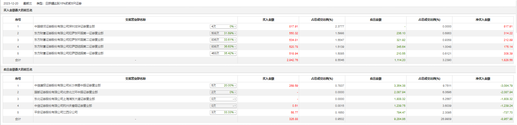 12月20日,*ST左江今日跌17.66%,全天换手率达9.25%,振幅达19.2%。龙虎榜数据显示,营业部席位合计净卖出7129.43万元。其中,中信建投证券长沙芙蓉中路证券营业部、国都证券北京北三环中路证券营业部分别卖出3354.38万元、2087.94万元;中国银河证券深圳龙华证券营业部、东方财富证券拉萨东环路第一证券营业部分别买入817.91万元、550.32万元。