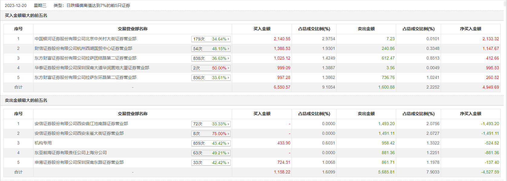 12月20日,恒大高新今日跌8.94%,全天换手率达41.26%,振幅达8.57%。龙虎榜数据显示,营业部席位合计净买入422.1万元。其中,机构买入433.9万元,卖出958.42万元,合计净卖出524.52万元。此外,安信证券西安曲江池南路证券营业部、安信证券西安朱雀大街证券营业部分别卖出1493.20万元、1491.11万元;中国银河证券北京中关村大街证券营业部、财信证券杭州西湖国贸中心证券营业部分别买入2140.55万元、1388.53万元。