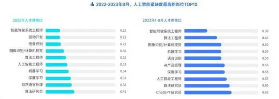 脉脉高聘人才智库发布的《2023泛人工智能人才洞察》显示,今年1月到8月,新发AI岗位平均月薪超4.6万元,人才供需比仅为0.39,相当于5个岗位争夺2个人才。