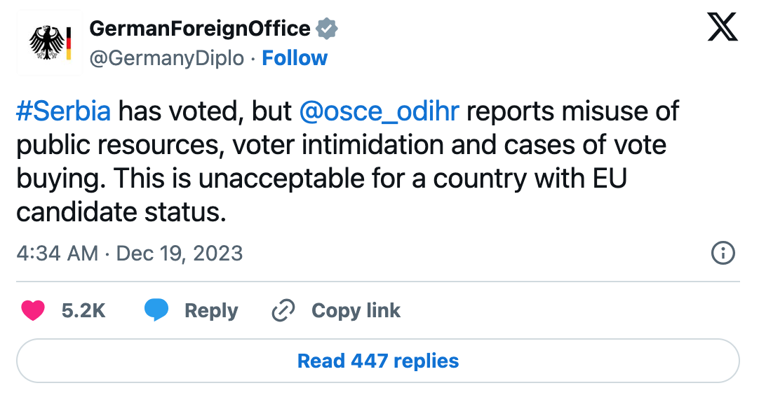 作为欧盟重要成员国的德国对塞尔维亚执政党进行了批评。德国外交部在社交媒体X上发文,称作为欧盟候选国,塞尔维亚在本次议会选举中暴露的不公平现象是不可接受的。