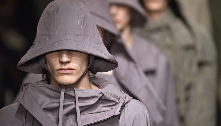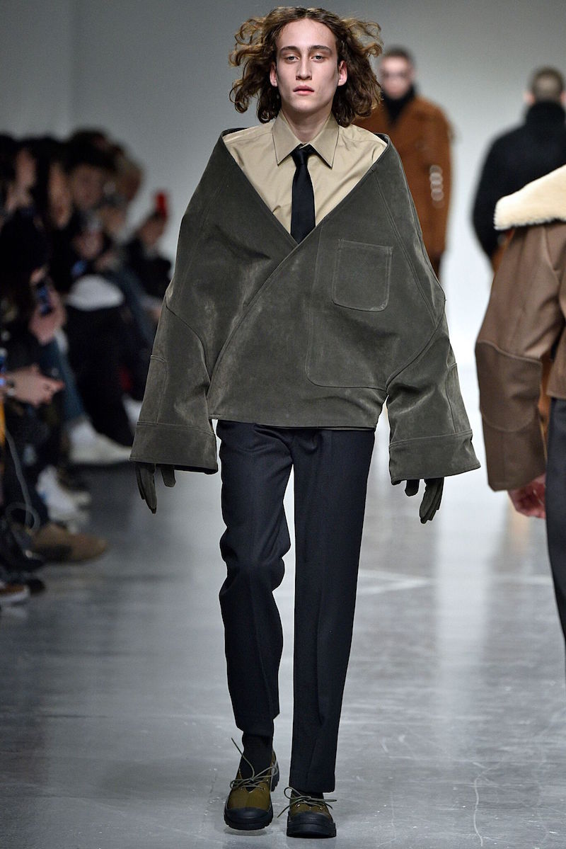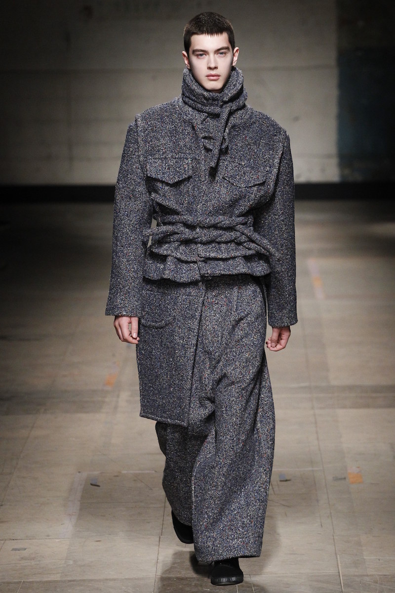 和去年动不动就把大衣卡到肩膀以下的造型相比,这一季的人们又开始好好穿衣服了。虽然秋冬系列延续的依然是春夏时关于“成人”的主题,但它们之间还是有一些差异,比如模特们头上顶着的帽子很像中国古代进京赶考的书生,脚上穿的也像是黑色布鞋,这些东方元素第一次在Xander Zhou这里变成了显性基因。