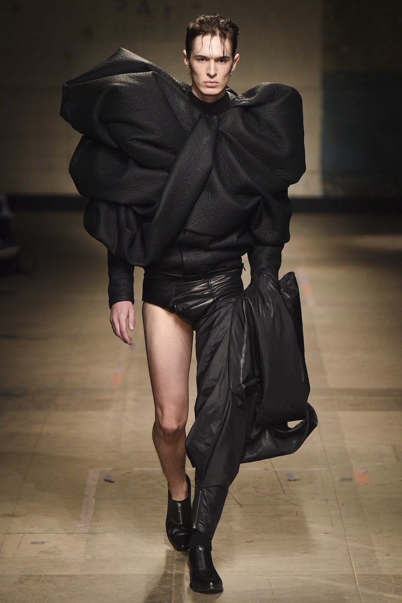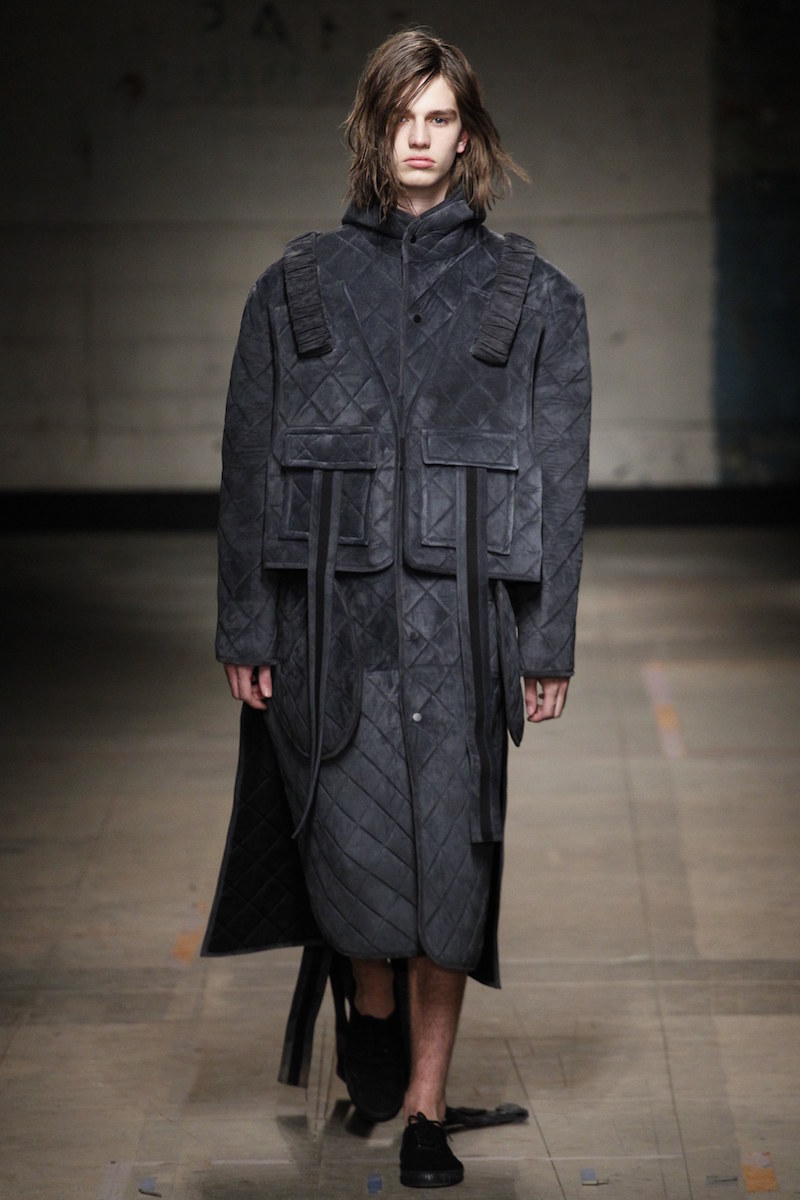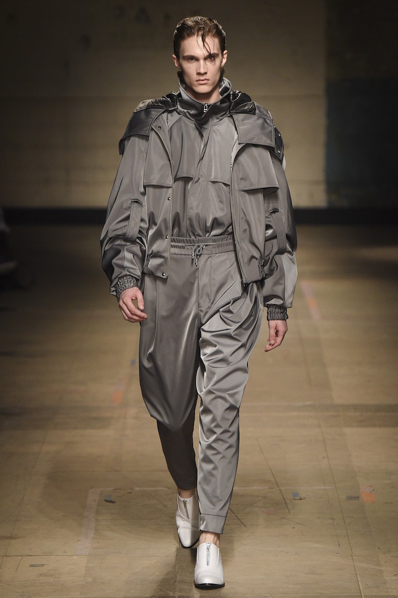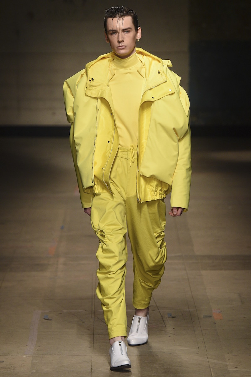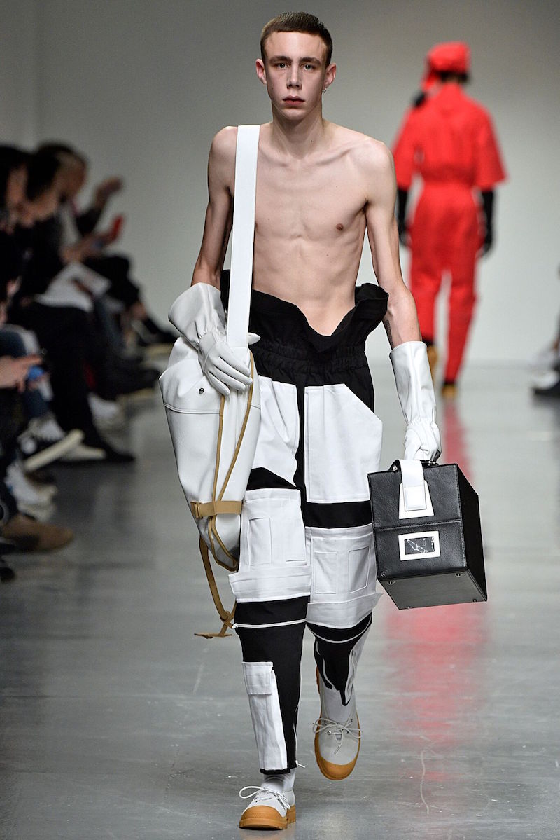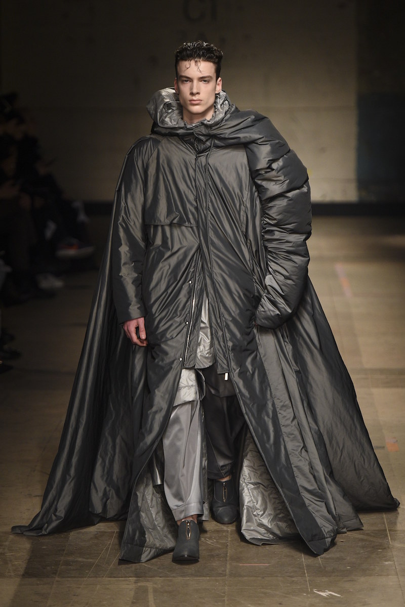 这也是延续了去年超厚型羽绒服的风潮,Marques’Almeida、Acne Studio、Peng Chen的羽绒服在各大社交平台上大火特火,可谓是实用性和时尚一次人性化的结合。系列中和Feng Chen Wang春夏季的“数字时代”类似的部分有羽绒服背后的交织节点和飘带设计,以及裤子还是类似防水服材质。