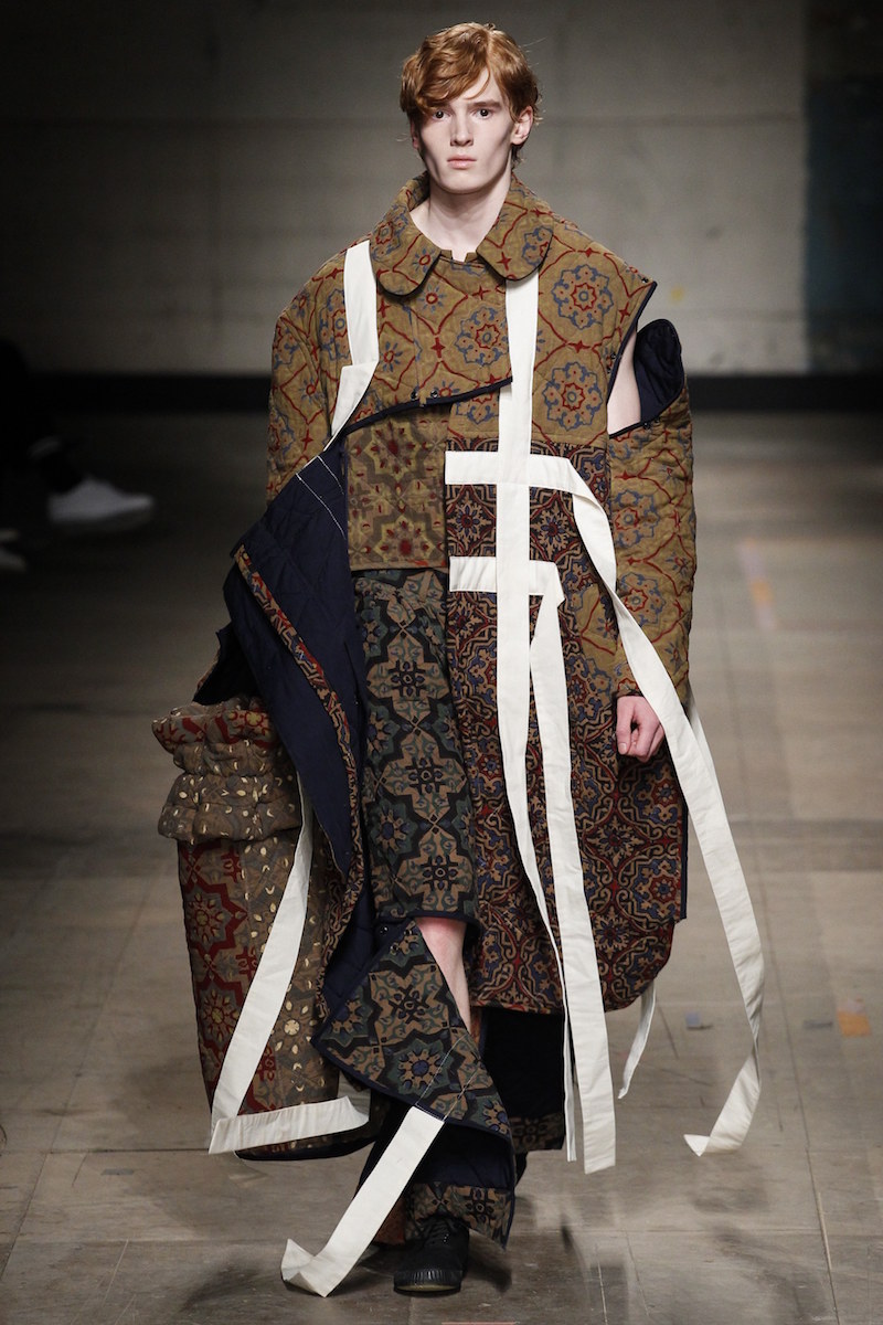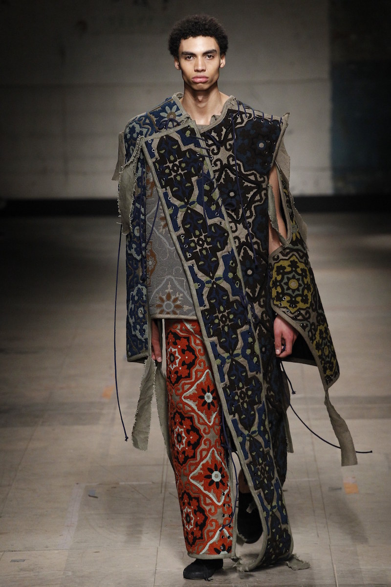 这一季的Craig Green,用了大量类似Tripitaka的音乐来配合走秀,Tripitaka是一种藏经,从现场来看,这首音乐和模特出场的匹配度几乎分秒不差。有人把印花地毯披在身上,还有人将裙带菜式的条带斜挂在肩膀,就像藏袍一样,只是为了实用防寒,没人会真的像藏民一样扯下一个袖子,所以条带成为了符号性的象征。
