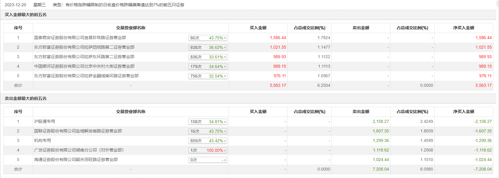 12月20日,内蒙新华今日跌停,全天换手率达52.91%,振幅达9.31%。龙虎榜数据显示,营业部席位合计净卖出1644.87万元。其中,机构合计净卖出1299.36万元。此外,沪股通专用、国联证券盐城解放南路证券营业部分别卖出2158.27万元、1607.35万元;国泰君安证券宜昌珍珠路证券营业部、东方财富证券拉萨团结路第二证券营业部分别买入1586.44万元、1021.55万元。
