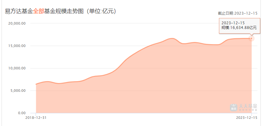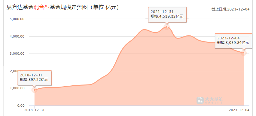 数据显示,易方达公司旗下混合型基金规模,从2018年底的897亿,2021年底上升到4539亿,如今已下滑到3039亿。截至2023年12月15日,易方达公司混合型基金资产占比18.27%。