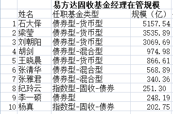易方达固收基金经理在管规模TOP10中,在管规模3000亿以上就有3人,分别是石大怿、梁莹、刘朝阳,其中,石大怿在管规模高达5157.54亿。