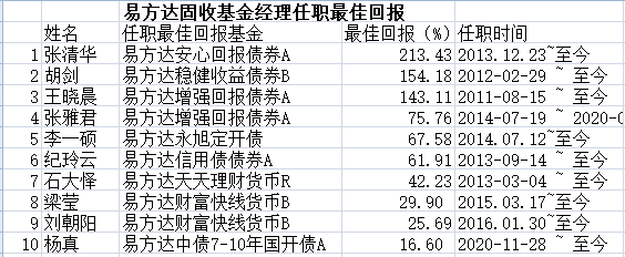 虽然在管规模第一,任职期间回报最高的人,并不是石大怿,而是在管规模仅568.89亿,且产品多是股债混合的张清华,最佳回报是213.43%,所在基金是易方达安心回报债券A,其从2013年12月管理至今。