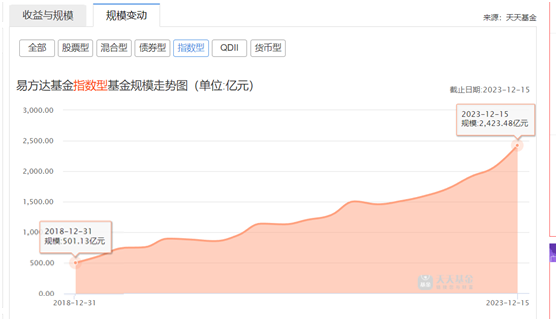 2018年底,易方达的指数基金仅501.13亿,不到5年,已发展到目前的2423.48亿,增长了3.84倍。截至2023年12月15日,易方达指数基金在总资产中占比14.57%。