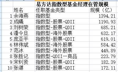 从在管规模看,在易方达指数基金经理TOP10中,在管规模600亿以上的5人,其中,余海燕在管规模1394.21亿。在管规模600亿以下的4人,规模最小的也在172亿。
