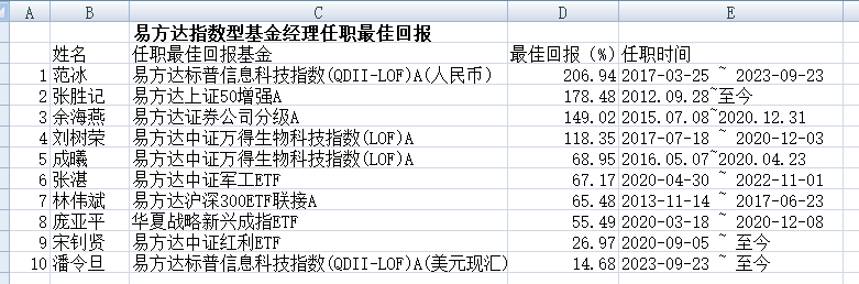 公司研究室注意到,这10位指数基金经理的最佳回报,有7人业绩来自已卸任基金。