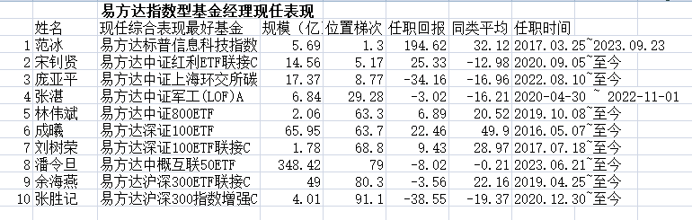 易方达指数基金TOP10经理,现任综合表现最好的基金中,10只有3只位居同类前10%,有6只排在50%以后,最差的1只排在91.1%。客观地说,这个成绩已很差了。
