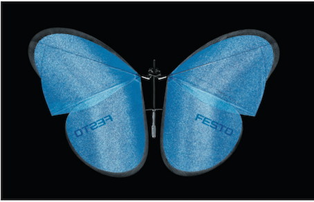 eMotionButterfly蝴蝶机器人是Festo首次将人工昆虫的轻巧构造与无碰撞飞行行为相结合的产品。该机器人的重量仅有40克,还包括了微型电池和电机,它可以通过摄像跟踪系统实现自主运行,还能最多15个同时工作并相互配合,甚至彼此间还可以“交谈”,而不会彼此碰撞。
