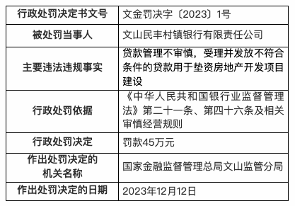 12月20日,国家金融监督管理总局文山监管分局行政处罚信息公开表显示,2023年12月12日,文山民丰村镇银行有限责任公司因贷款管理不审慎,受理并发放不符合条件的贷款用于垫资房地产开发项目建设,被处罚款45万元。