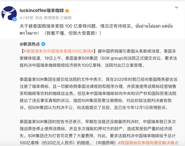 针对被50R集团索赔一事,瑞幸咖啡回应称,关于被泰国假瑞幸索赔100亿泰铢问题,情况还有待核实。并在回应后面附了一句泰语,意为“我看不懂,但我大受震撼!”