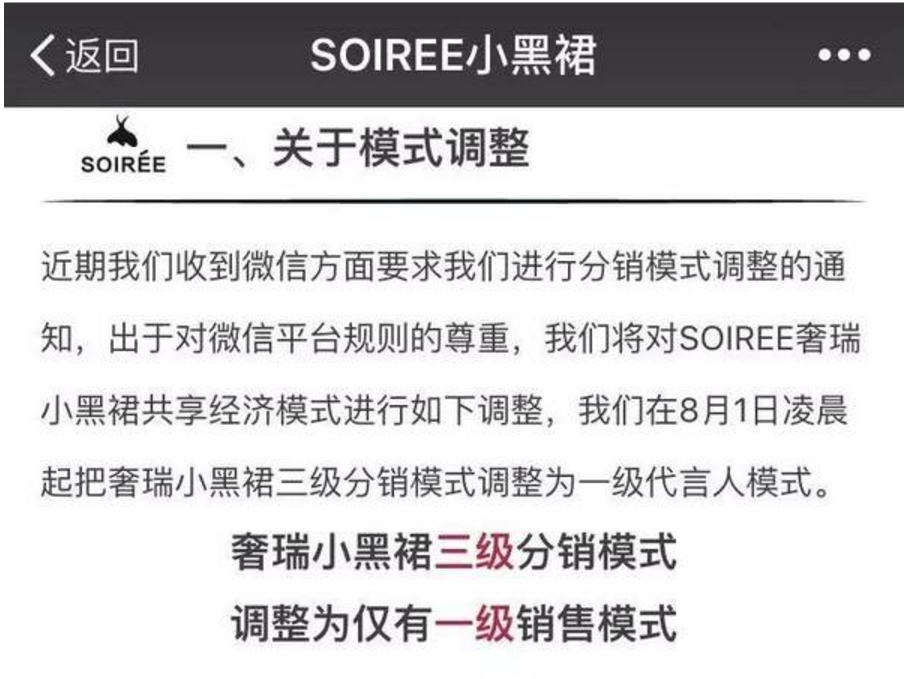 话是说得理直气壮,但是行为上还是做出了妥协,在之后的8月1日,小黑裙再次发布公告:将从8月1日凌晨起把三级分销模式调整为一级代言人模式。