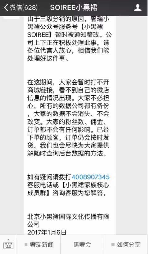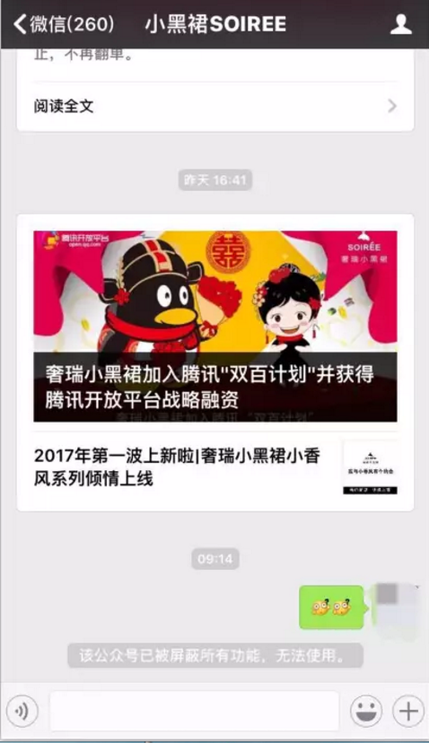 今天(1月6日)微信分销神话“SOIRÉE奢瑞小黑裙”(下文简称:小黑裙)被曝出微信号被封,点击进小黑裙公众号就看见“该公众号已被屏蔽所有功能,无法使用”。