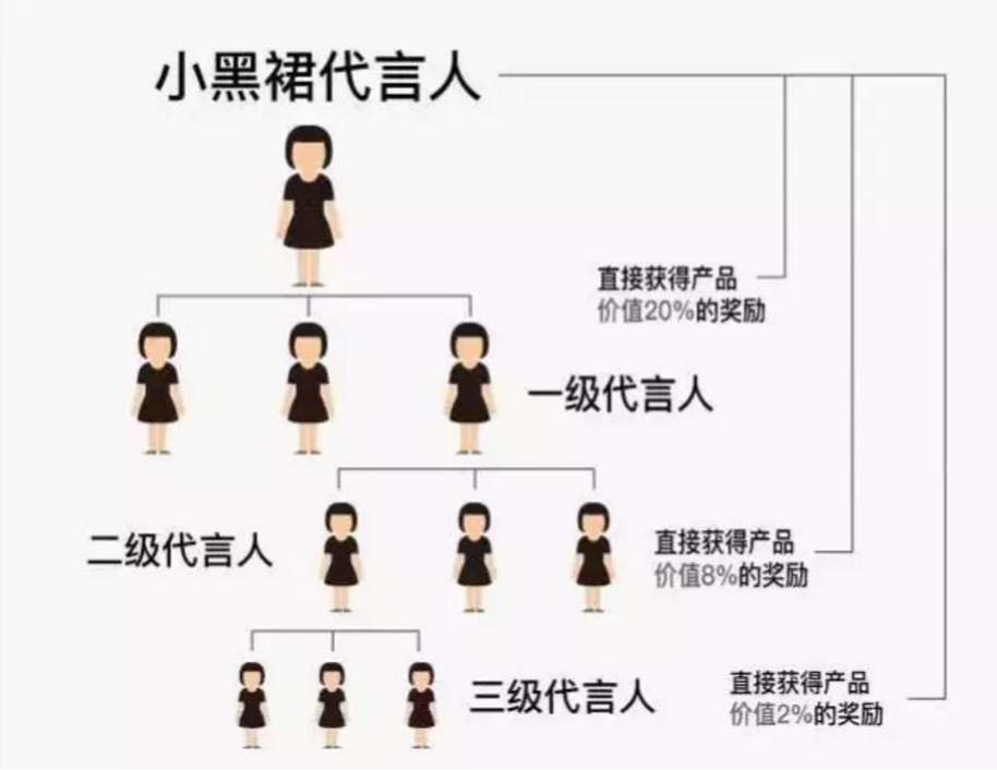 仅仅靠着这些定价在299—599元之间、包含适用于各类场景的小黑裙,成立1周年的小黑裙就能完成近亿销售额,他们的“代言人模式”即我们通俗意义上讲的“三级分销模式”是神话造就的关键。