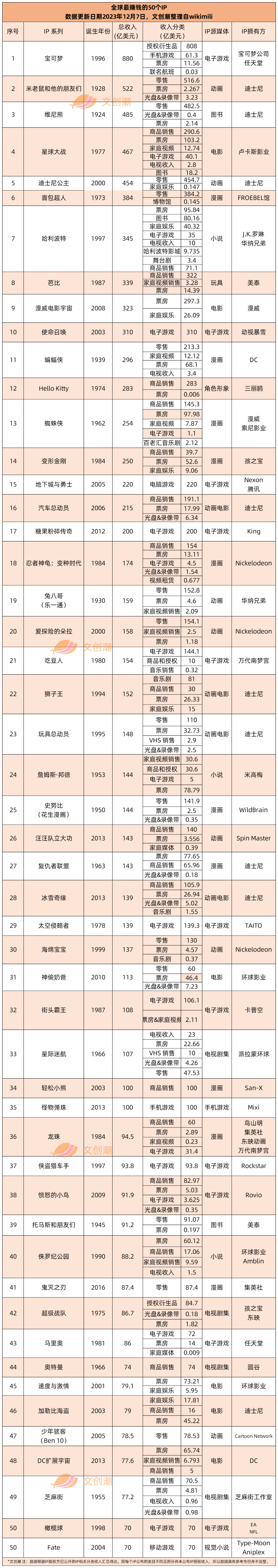 全球最赚钱的50个IP榜单,数据来自wikimili
