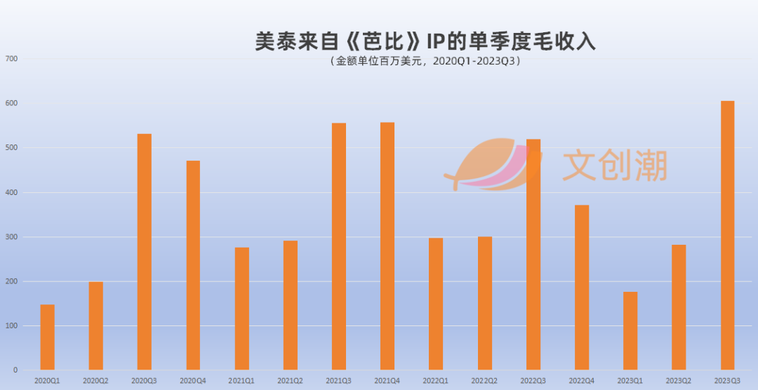 从IP 的整体收入看,“芭比”在Q2的收入走高,第三季度创下了两年内的新高。