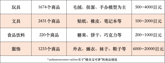 除了卡牌,从pokemoncenter-online可以查询,IP衍生品的品类也在为低龄化的用户服务,不管是玩具的价格,还是文具的品类、食品饮料种类都在向这部分核心用户群靠拢。