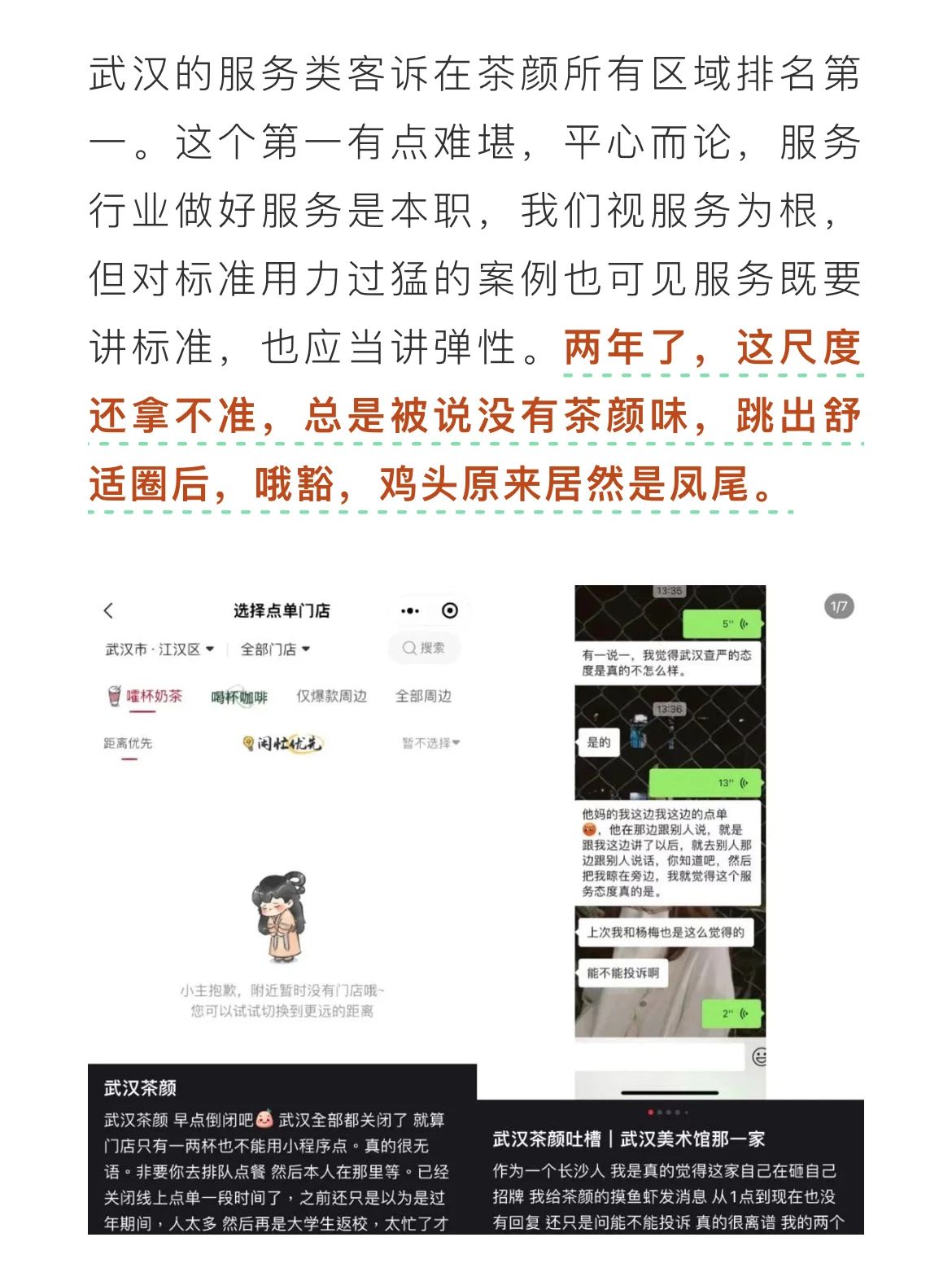 ▲ 茶颜悦色发布回应武汉服务类客诉的文章。图 / 茶颜悦色公众号