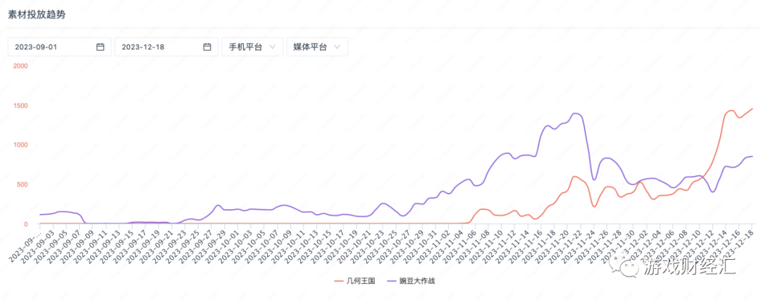 其中《几何王国》(红线)素材投放反超《豌豆大作战》(紫线),达到单日1400条创意的高峰。这也是前者在小游戏畅销榜排名更靠前的主要原因。