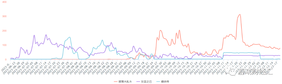 从投放素材量来看,ADX显示,三款小游戏整体投放力度较低,《女巫之刃》和《萌侠传》投放峰值不超过200组,《部落大乱斗》峰值不超过300组,这或许是前两款产品表现平平的原因(《部落大乱斗》曾进入微信小游戏畅销榜前30)。
