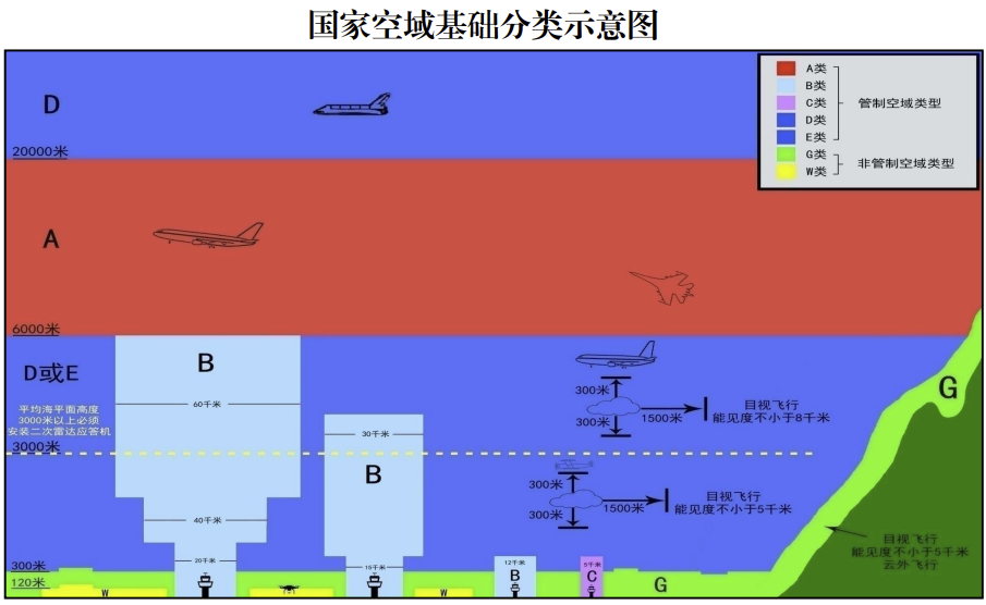 《方法》提出,依据航空器飞行规则和性能要求、空域环境、空管服务内容等要素,将空域划分为A、B、C、D、E、G、W等7类,其中,A、B、C、D、E类为管制空域,G、W类为非管制空域。