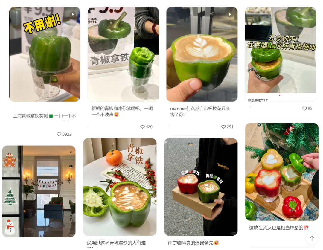 我发现,在“青椒拿铁”火热出圈后,各类“用食物做杯子”的咖啡陆续出现。